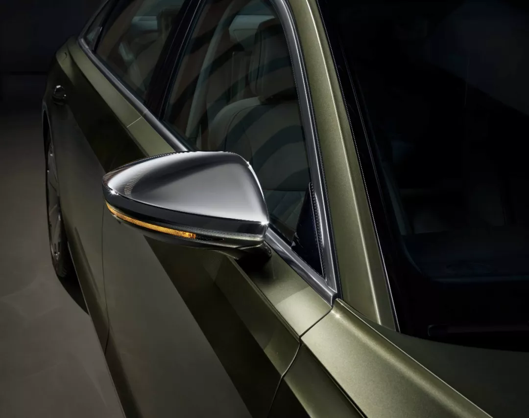 其次,A8L Horch创始人版利用了大量镀铬元素来与普通车型区别开来,全镀铬的中网、保险杠饰条、后视镜外壳,只要是能用镀铬装饰的部分就绝对不会用其它材质代替。