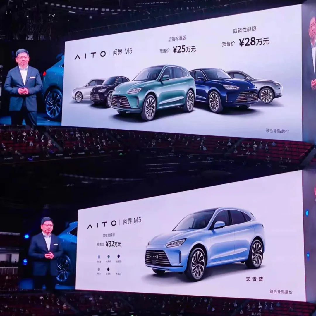 而最终压轴出场的,也可以说是华为今年最重磅的产品,由华为主导开发的首款搭载最新HarmonyOS智能座舱的新能源汽车——AITO问界M5,并给出了25、28、32万元预售价,对应后驱标准版、四驱性能版、四驱旗舰版。华为将在ICT行业的领先技术积累赋能汽车行业,帮助车企造好车。AITO问界M5为用户带来了兼具高智能化、卓越性能以及超长续航的智慧出行体验,开创了智能出行新纪元。接下来《车壹圈》就带大家一起看一看AITO问界M5究竟是怎样的存在。