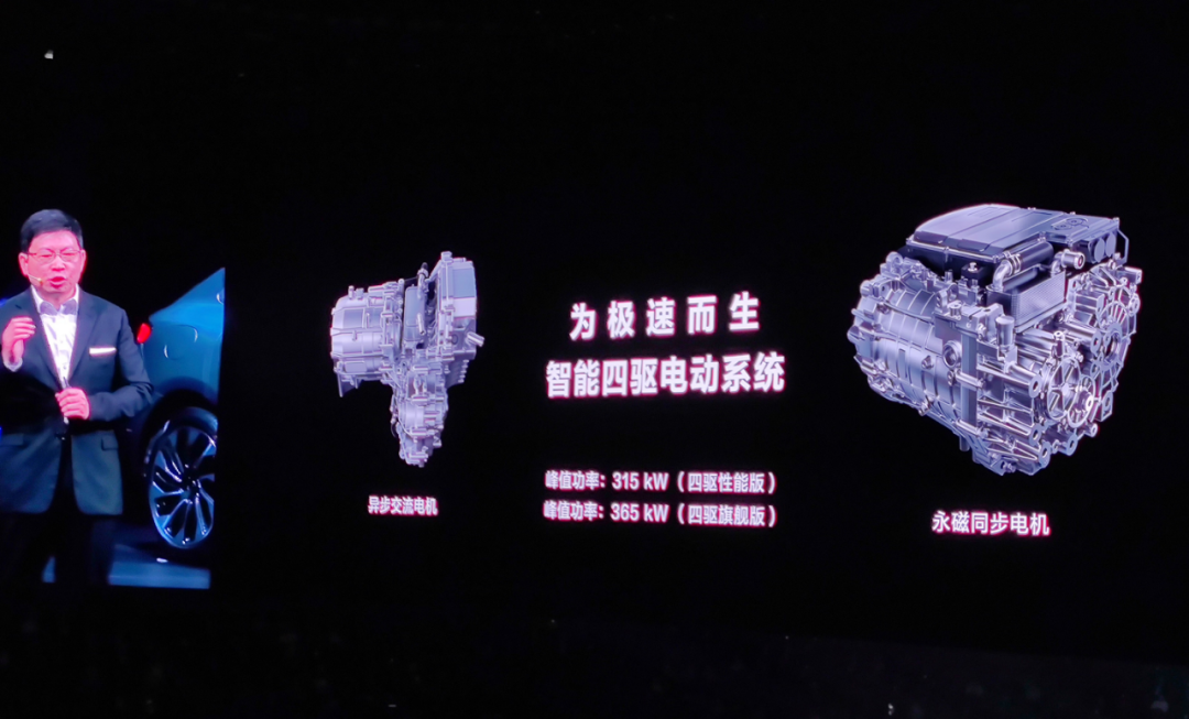 前异步交流电机,后永磁同步电机的组合兼顾了快速响应与巡航经济性,并且两者的组合还能迸发出最高365千瓦的恐怖输出。