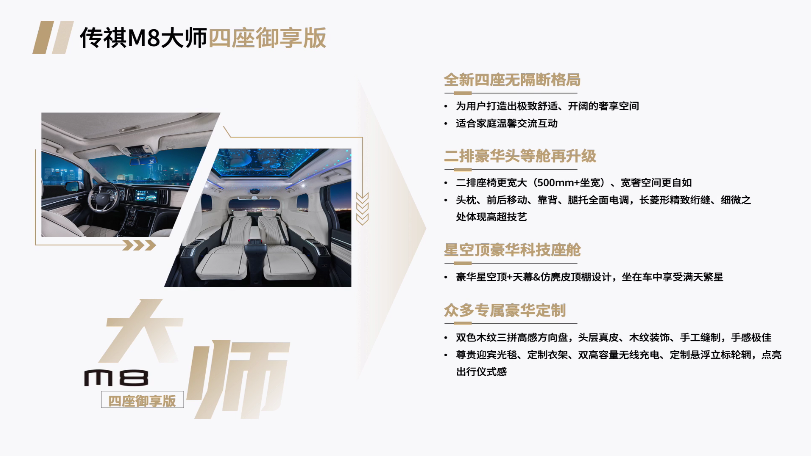 再来看看传祺M8大师四座御享版。该车内饰采用了全新四座无隔断格局,为用户打造更加极致舒适的驾乘空间。其中,二排豪华头等舱再升级,二排座椅更加宽大(500mm+坐宽),头枕、前后移动、靠背、腿托全面电调。同时,座椅采用了长菱形精致绗缝,质感非常不错。豪华星空顶、天幕&仿麂皮顶棚设计,那是相当的奢华。此外,诸如双色木纹三拼高感方向盘、头层真皮、木纹装饰、迎宾光毯、定制衣架、无线充电、定制悬浮立标轮毂等专属豪华定制也都有配置,带来更加奢华的用车体验。
