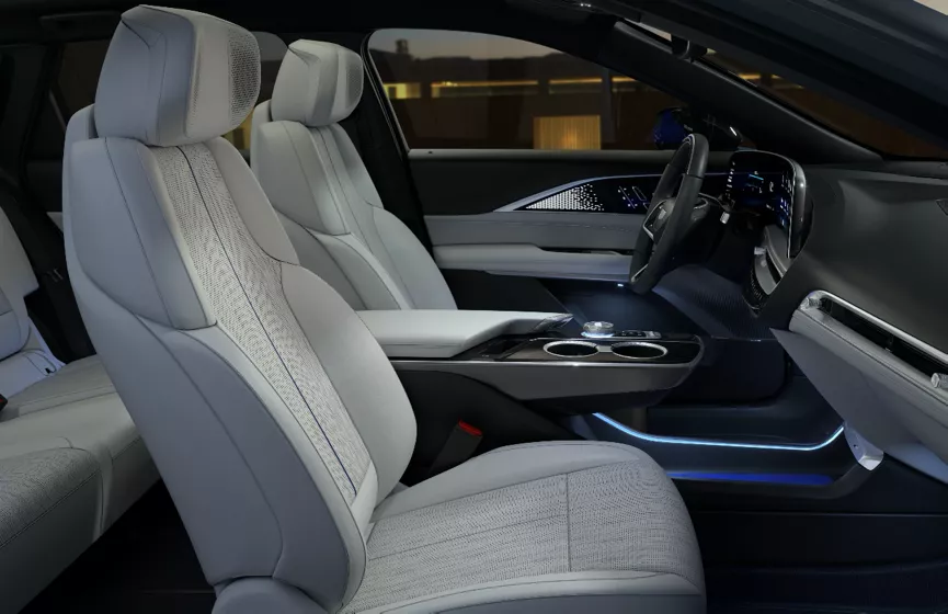 除了低坐姿的感觉,LYRIQ的座椅材质也是非常值得一说。LYRIQ座椅面料采用了GRS全球回收标准(GLOBAL Recycled Standard)认证的环保材料以及Nuvous材质,高配更是采用了NAPA真皮,既保证了通风透气性能,同时具有良好的回弹和支撑性,为乘客提供躺椅般的豪华舒适乘坐体验。