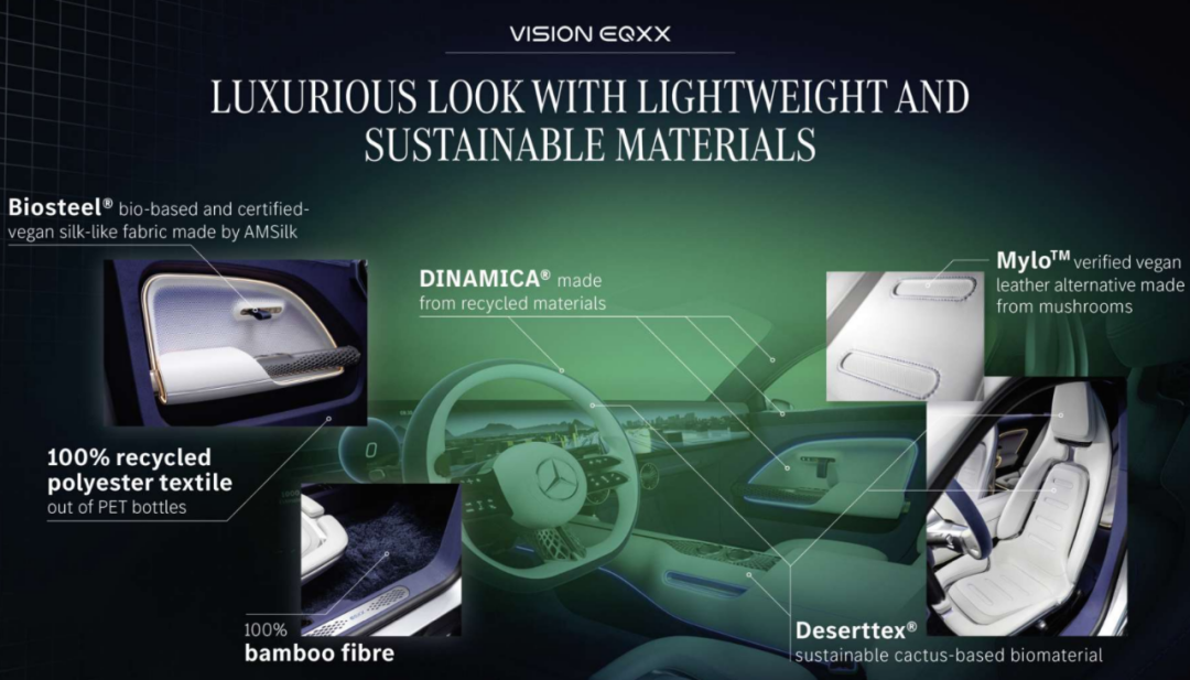 此外,大量可回收材料的运用是其内饰最大的亮点,他们可能来自于仙人掌、竹子、蘑菇、塑料瓶、纸板、食物垃圾,甚至用过的婴儿尿布。例如EQXX的门把手由 AMsilk 的 Biosteel 纤维制成,它是一种类似于丝绸的高强度织物。另一种装饰内饰的材料称为 Mylo,这是一种由菌丝体制成的纯素皮革替代品,地垫则是由100%竹纤维制成。