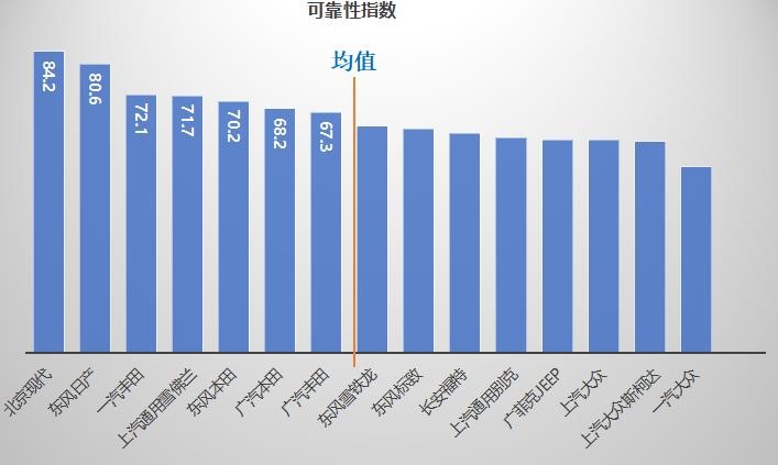 而日韩系产品可靠性指数则表现良好,比如市场表现并不抢眼的北京现代却占据了合资阵营可靠性评价指数第一。而日系汽车,比如东风日产、广汽本田、“南北丰田”均跨过了可靠性平均线。