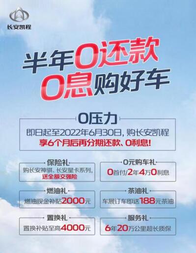 5月的尾巴越来越短,2022年即将过半。奔富路上的创业者们也将开启下半年的奋斗计划,一直以“用户为中心”的长安凯程也贴心推出#半年0还款,0息购好车#优惠活动,助力他们创富更轻松。即日起至2022年6月30日,购长安凯程系列车型,享6个月后再分期还款、0利息,并有六大好礼豪横相伴。具体为: