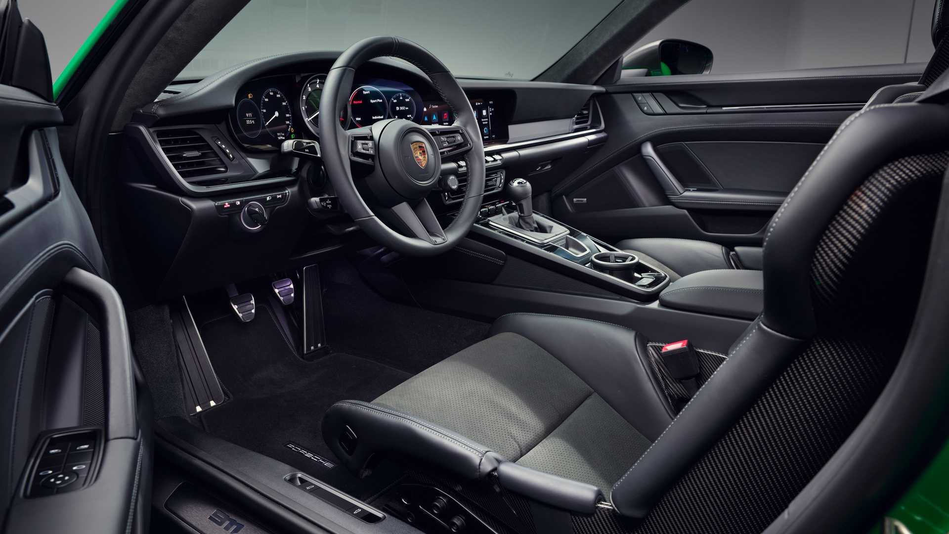 内饰方面,新车标配GT运动型方向盘和4向可调节的运动型电动记忆座椅,并可选配带18 向电动调节的自适应运动型座椅以及门板扶手、中控台和仪表盘上的真皮内饰。内饰颜色上新车主要采用深灰、哑光黑和高光黑的色彩组合,选装的内饰套件在安全带、座椅条纹、装饰缝线、头枕上的 911 徽标和地板垫等位置提供具有对比色风格的板岩灰或蜥蜴绿装饰。