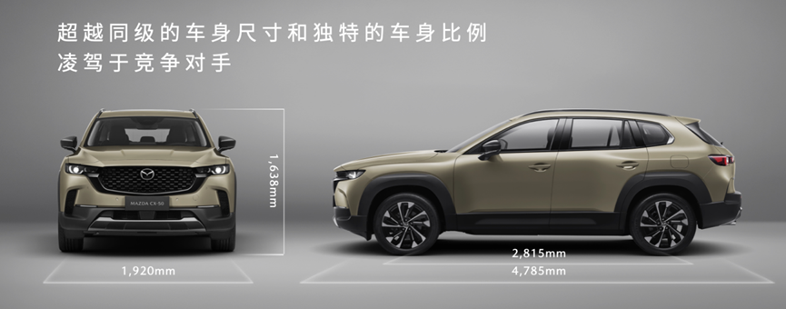 具体到细节,国产版全新马自达CX-50则是在多方面进行了特殊设计,其长宽高分别为4785mm×1920mm×1638mm,轴距为2815mm,更大尺寸的意义在于为中国消费者提供尤为在意的“大空间”。国产版车型较海外版,在后排腿部空间进行了优化,乘坐空间增加了55mm,同时,后排中央地台的高度也有所降低,以保证高频遭遇“满载”情况的国内用户拥有更佳的出行体验。