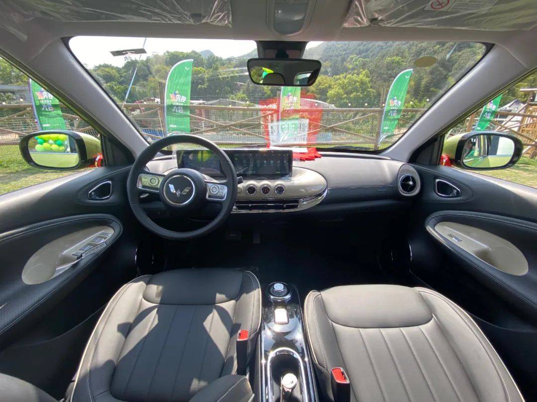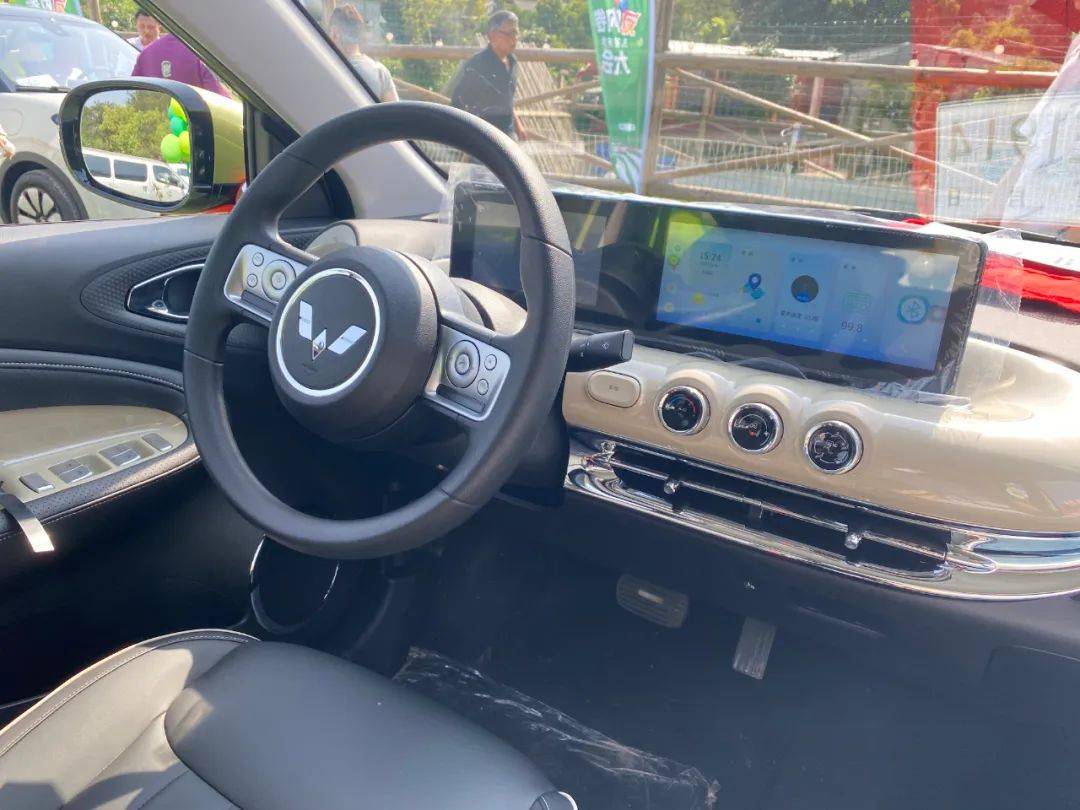 通常情况下,10万元以内的纯电小型车内饰都不咋地,硬塑料材质居多,更别提什么质感。但五菱缤果似乎听到了大家的吐槽,给到了用户皮质方向盘和皮质包覆的中控台,加上双10.25英寸双联屏,虽谈不上多高级,但绝无廉价感。