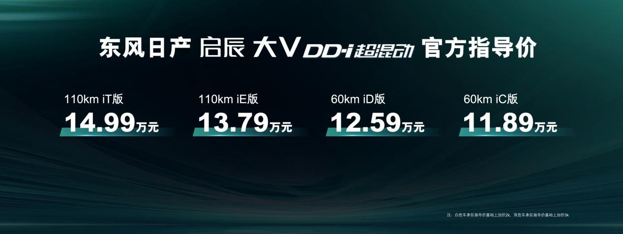 新车共推出了4个版本,其中,启辰大V DD-i超混动60km iC版官方指导价11.89万元,60km iD版官方指导价12.59万元,110km iE版官方指导价13.79万元,110km iT版官方指导价14.99万元。