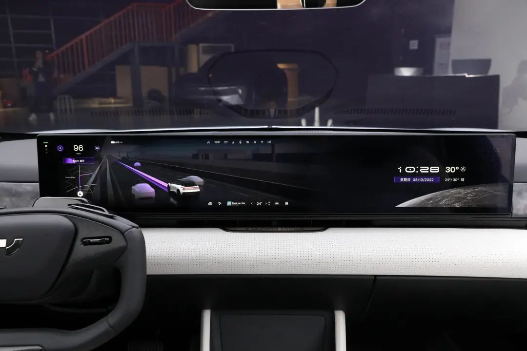 外观方面,极越01采用了简约的设计风格,车头为封闭式设计,配备了贯穿式日行灯,以及T字型前大灯组。大灯组造型怪异,灯腔内的结构也比较复杂,整体来说视觉效果还是可圈可点的。极越01全车配备了共31颗智能辅助驾驶传感器,其中两颗激光雷达隐藏在前大灯模组中间,很好地融入车身造型当中。