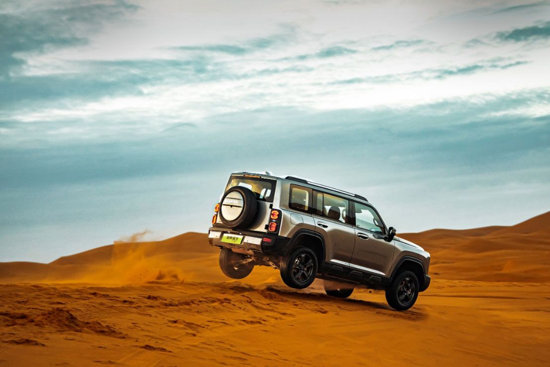 侧面来看,新车给人感觉底盘很高,设计上稍有收敛,没有加入太多激进的元素修饰。新车最大涉水深度560mm,爬坡角度高达60%,是一款硬派越野车。车身不仅加入了一些黑色套件,还有防撞擦护板。尾部的设计很简单,和哈弗家族的车型造型一样,观感立体,尾门开合方式为侧开,灯组为独立设计,竖直分布,后面还悬挂有备胎。