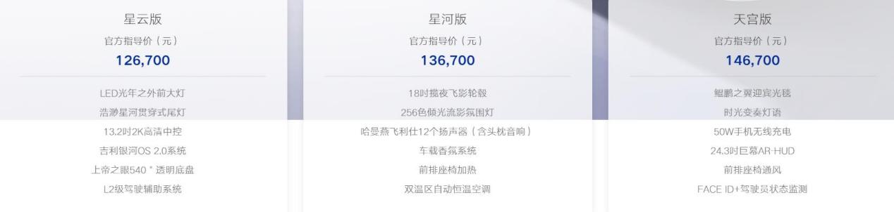 吉利星瑞L智擎的尺寸空间、油耗动力、智能体验、安全性能、健康指数、格调设计全面领先同级车,那么其售价是否也因此高出同级车型一大截呢?非也,吉利星瑞L智擎全系共三款配置车型,指导价分别为12.67万元、13.67万元、14.67万元,比我们熟知的日系HEV紧凑型轿车更务实。
