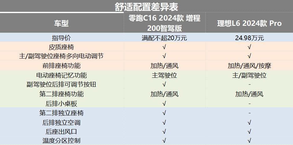 除了激光雷达外,零跑C16还配备了多项智能驾驶辅助系统,如自适应巡航、车道保持、自动泊车等,这些配置都大大提升了驾驶的便捷性和安全性。从对比表格中,不难发现零跑C16的舒适性配置与理想L6差距不算特别明显,考虑到它的价格更低,所以优势更明显。在圈哥看来,C16丰富的配置让驾驶者能够享受到更加智能化、舒适化的驾驶体验。