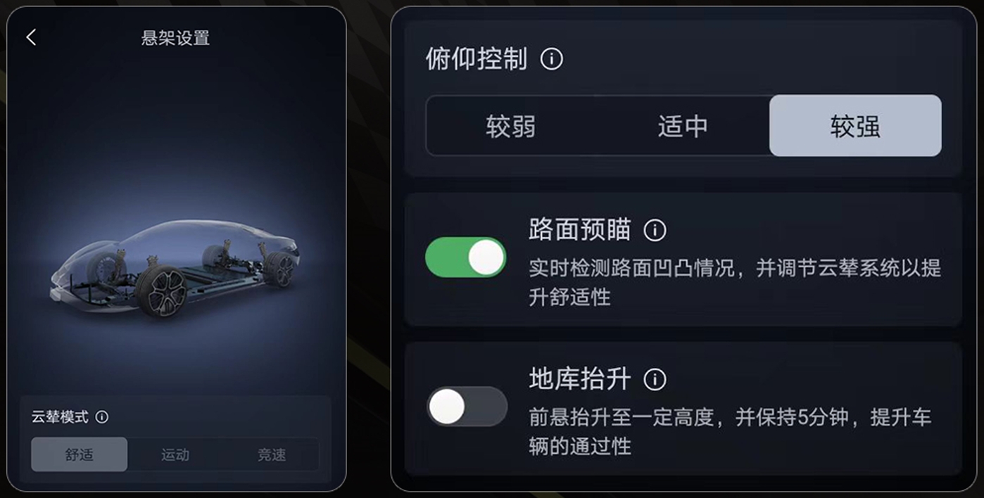 基于易四方、云辇-X等核心技术,仰望U9打破了传统超跑赛道、街道性能边界,既具备极致的操控性,又兼顾日常驾驶的舒适性,给用户带来对于超跑的全新认知和体验。仰望U9可实现的“飞跃功能”、“原地起跳”、“随乐舞动”、“摇篮模式”、“执掌舞动”等“可玩”功能,这些都是“创新人车交互、丰富用户体验”产品设计思考下,云辇-X独有的技术能力的体现。