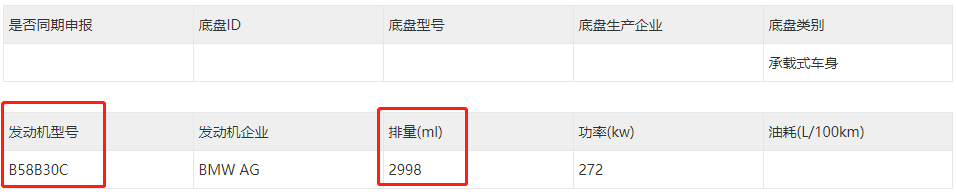 从工信部公布的第351批《道路机动车辆生产企业及产品公告》新产品公示中可以发现宝马X5的申报信息赫然在列,并且有两个产品型号,为了区分这两个型号,笔者看了一下具体的信息,两个型号分别对应的就是2.0T车型和3.0T车型,分别对应的发动机型号为B48B20G、B58B30C。其中3.0T发动机与进口宝马X5的3.0T发动机为同一型号。