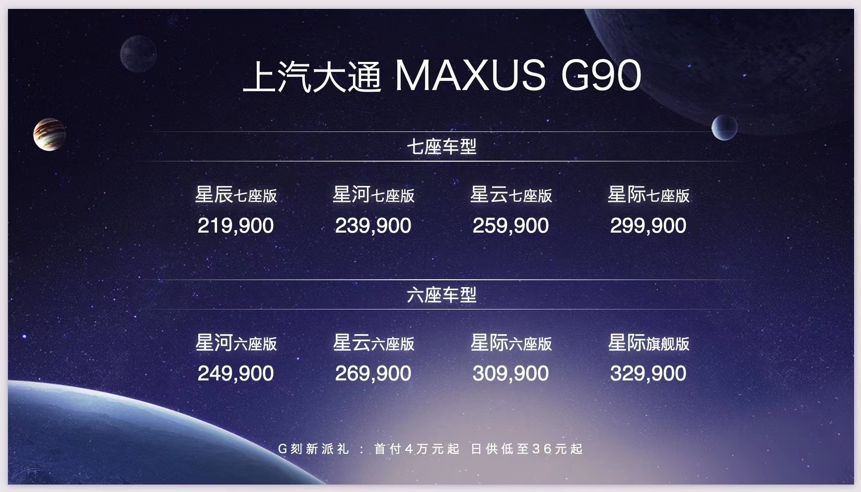 2022年4月29日,上汽大通MAXUS G90正式上市,定位为大型MPV,直接对标别克GL8、本田奥德赛、丰田塞纳等。这次发布会最让人惊喜的是,G90七座版的售价仅21.99万起!之前有媒体报道称23万起呢?怎么不加价还降价了?比起竞品动辄40万的价格,有的甚至还要加价提车,不禁发出来自用户的怒吼:良心啊!G90的售价才是所谓的家用MPV的价格啊!通过价格也能看出,上汽大通才是最懂国内家庭用户的车企。