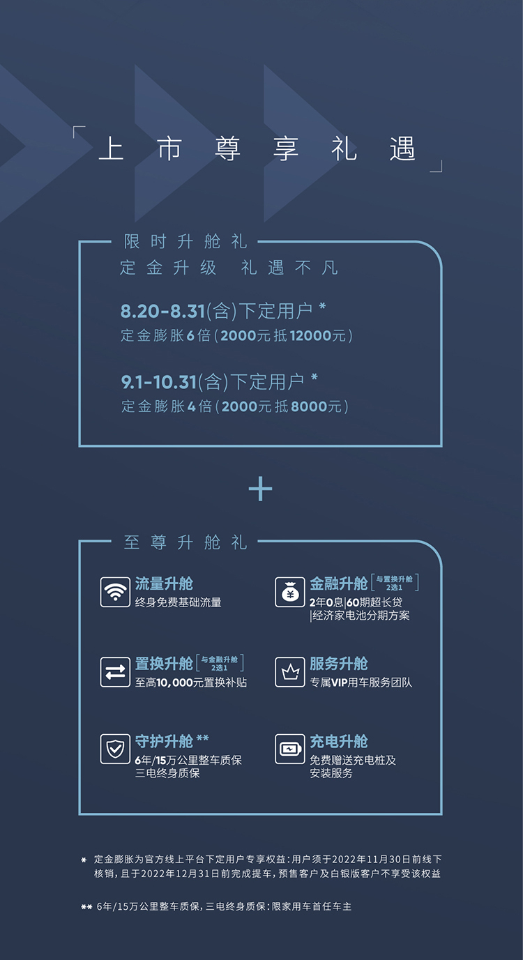 自即日起至2022年10月31日,通过上汽荣威APP、上汽荣威官方抖音平台下定,用户即可享受“限时升舱礼”。8月20日-8月31日(含)下定,可享2,000元抵12,000元购车款;9月1日-10月31日(含)下定,可享2,000元抵8,000元购车款。此外,中国荣威悉心为用户准备了丰厚的“至尊升舱礼”,包含流量、金融、置换、服务、守护、充电六重升舱礼遇,助力用户开启美好的智能纯电出行生活。
