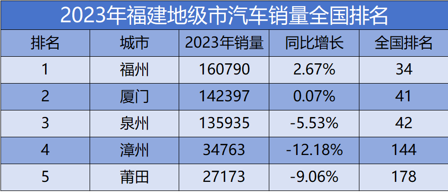 2023年福建各城市汽车销量榜,福州销量第一,厦门新能源第一