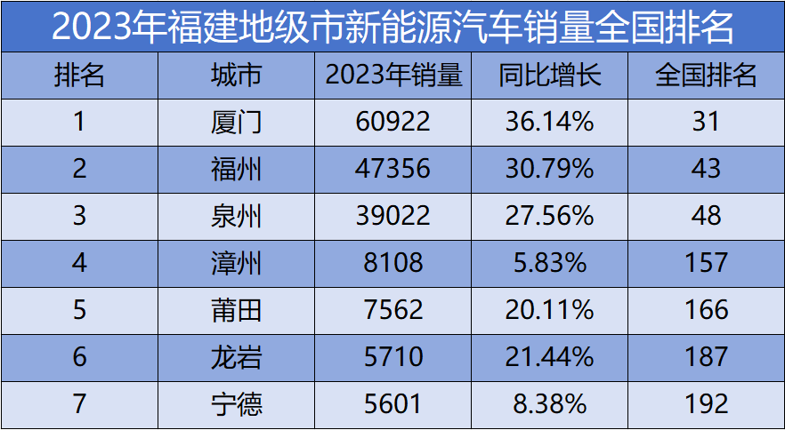 福建省各城市新能源汽车销量排行榜:全面增长,厦门幅度最大